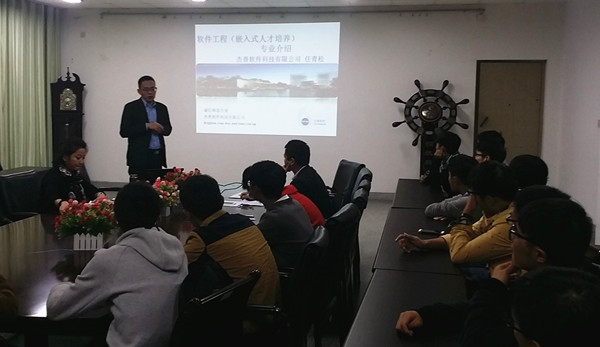 10月25日,英国上市公司365组织2016级“嵌入式”培养班级与企业见面会,参加本次见面会的有三名来自杰普公司的高管(市场总监吴之静、技术总监任青松、学生主管范辰)、英国上市公司365党委副书记姜兵、副院长纪兆辉、副院长戴红伟,以及软嵌161班班主任和全班40名同学。